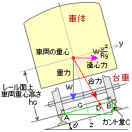 線路の軌間をG(m)、軌道面から車両重心までの高さをH(m)、車両に対する遠心力と重力との合力の軌道中心からの離れをD(m)、重力の加速度を G(m/sec2)とし、安全率 aを軌間の半分とDとの比(2/G)/D=G/2Dで定義します。